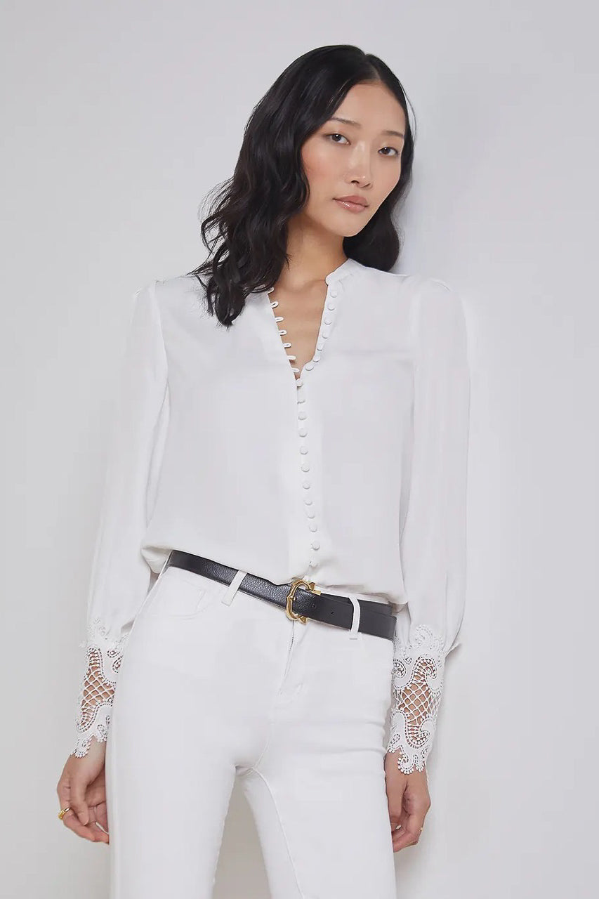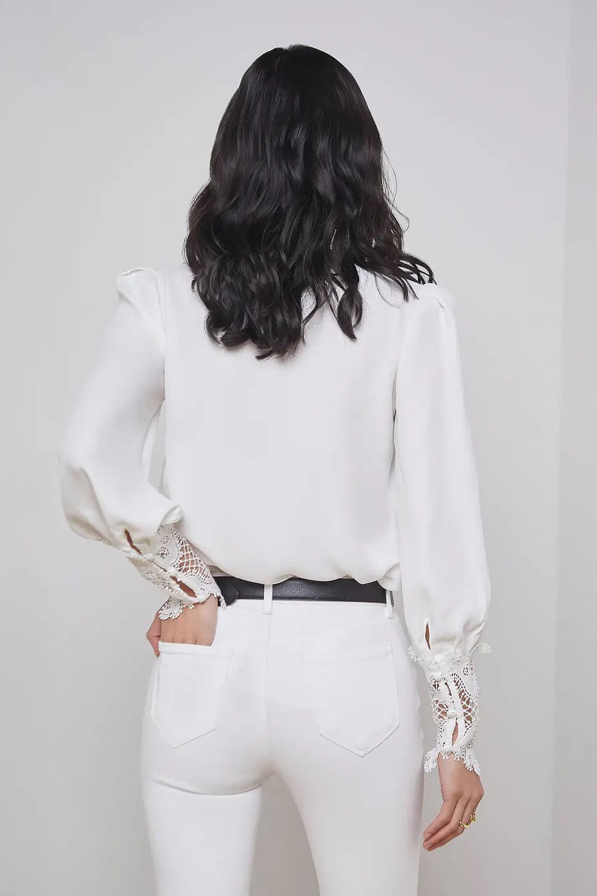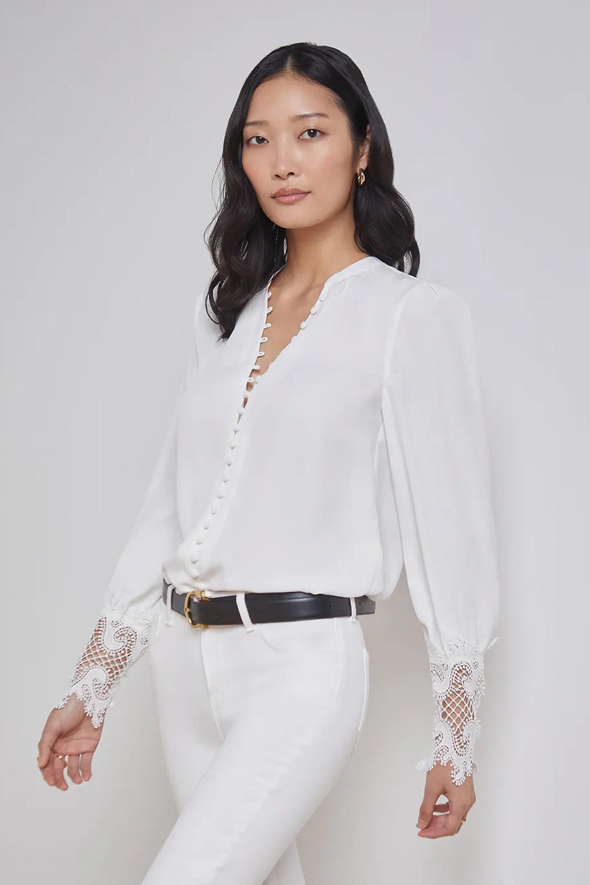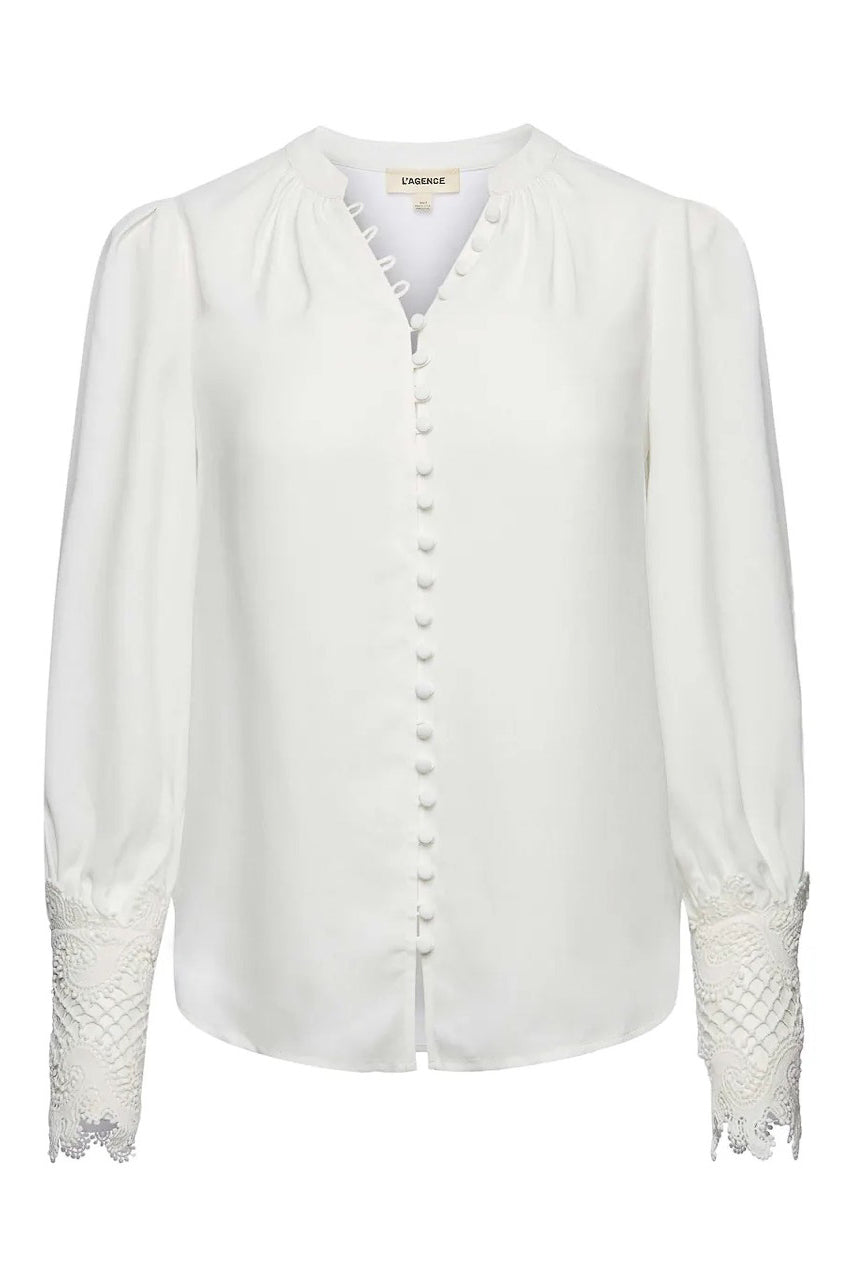 A sublimely chic blouse in ivory. Features vintage-inspired self-button-loop closure and extended cuffs done in exquisite scalloped guipure lace. Relaxed high-low silhouette gathered into band collar. Long sleeves with pleated caps. Front button closure.