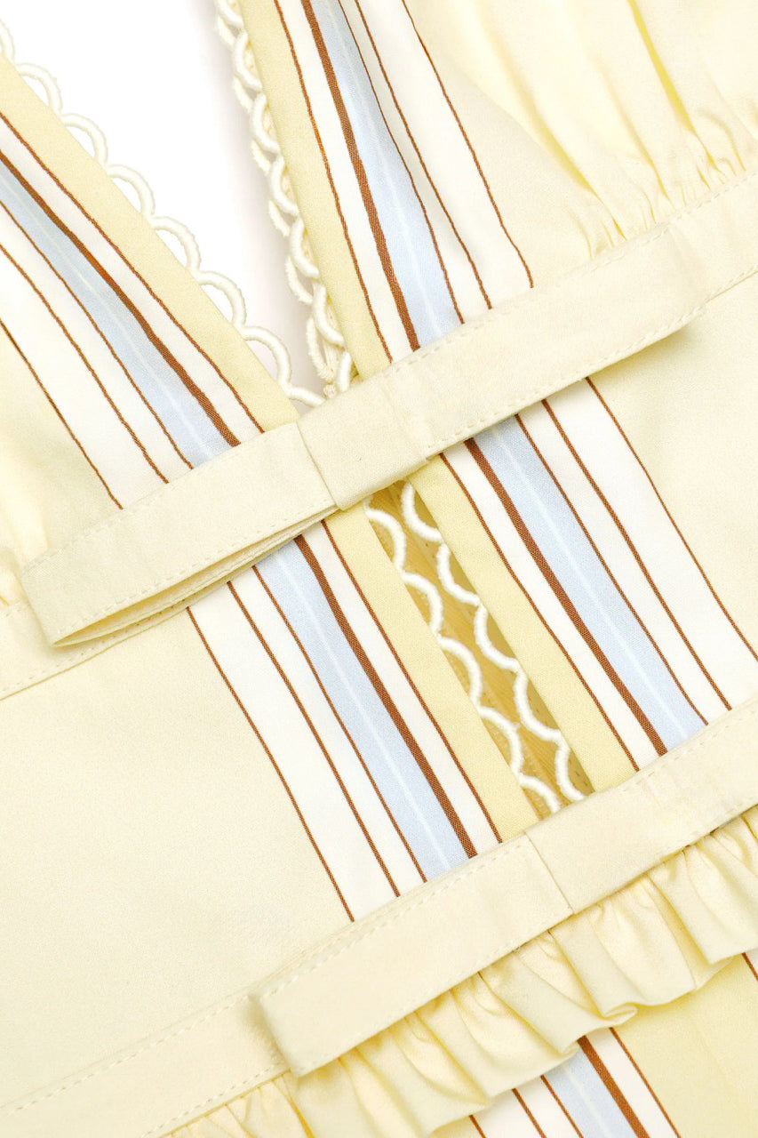 Totally chic, this lemon-hued midi dress offers a fresh take with its scarf-inspired floral print. Bow motifs accent the bodice, while flirty ruffles lend extra charm above a full, flowing skirt.